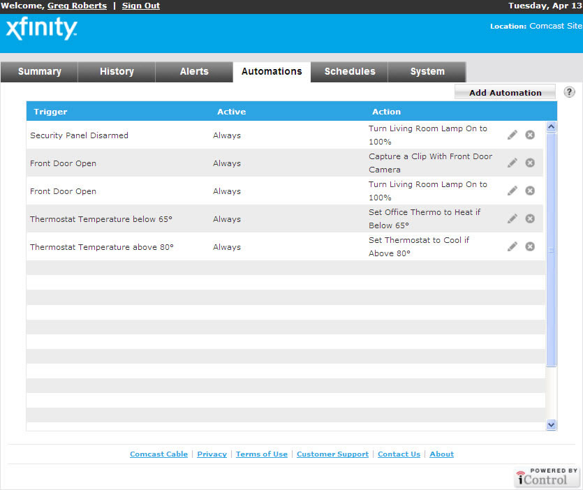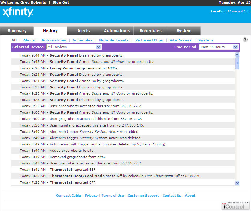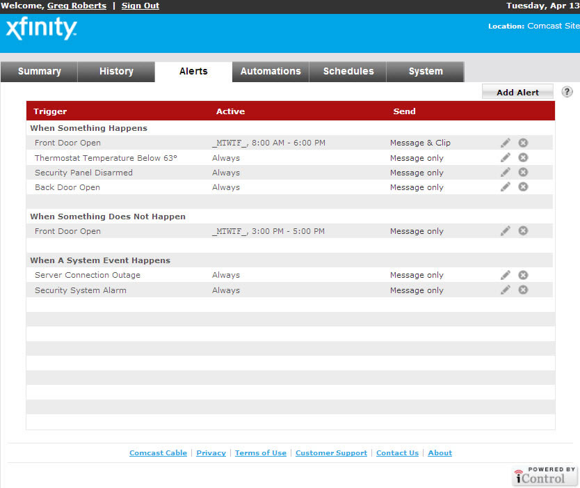 Set your system to send e-mail or text message alerts to you and others when events occur, or do not occur, in your home.
