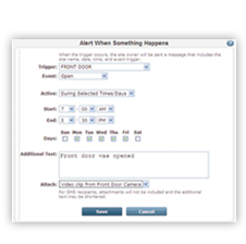 | Receive alerts when a package arrives or when your kids come home. | Choose specific time windows for events to occur. If the intended action does not happen during this time, an alert will be sent. | Monitor elderly parents by using “Anyone Home” mode to receive notifications when no activity is detected. | Attach video clips and pictures to alerts when cameras are installed in your system. |