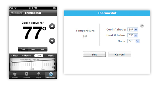 | Conserve energy by using the web portal, mobile portal or iPhone app to check and adjust the temperature remotely. | Set and save vacation settings to preserve energy while you’re away. |