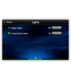 | Turn any light connected to the system on or off from the touch screen. | Set and save vacation settings to make your house look occupied while you’re away. | Schedule events to trigger specific lighting patterns. | Use remote devices and scheduling options to program your lights so you’ll never come home to a dark house again. |