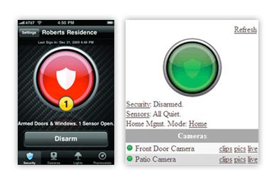 | Disarm the door remotely to let your children or a neighbor in. | Arm/disarm your system on-the-go through the web portal, mobile portal or iPhone app. |